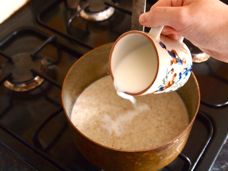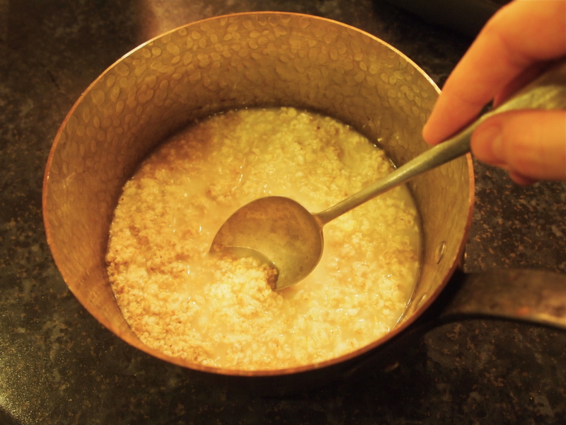 The following morning, add the milk to the soaked oats and simmer for about 20 minutes on the lowest heat possible. Add a little extra milk if it gets too thick or dry.